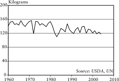 Figure 1–2 Grain Production Per Person in Sub-Saharan Africa, 1960–2004