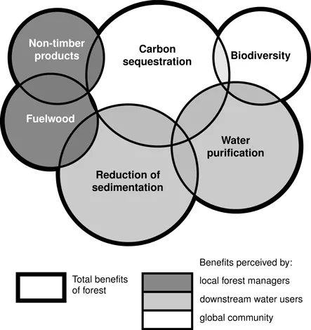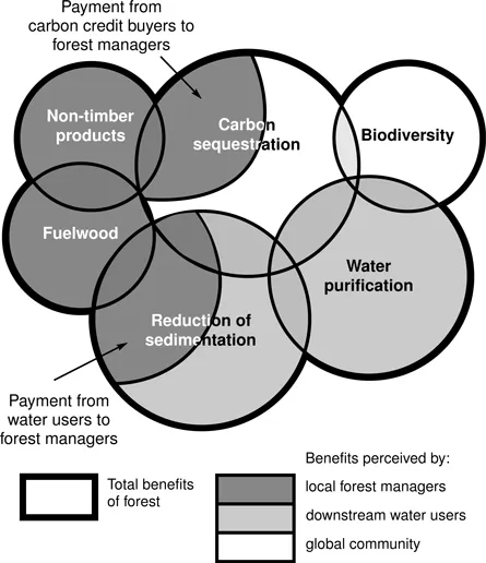 Figure 1.1 illustrates the problem in stylized form. Each circle represents one of the services provided by a particular forest. For the purposes of illustration, six such services are shown. Depending on the characteristics of the forest and of the users of each service, the circles may differ in magnitude: the forest illustrated here, for example, has large hydrological benefits and carbon sequestration benefits, but relatively minor biodiversity benefits. Other forests will have different benefits, in both absolute and relative terms. The figure also illustrates that some of these benefits overlap each other to varying degrees. The total benefits of the forest are given by the sum of its constituent benefits. Different stakeholder groups will tend to perceive a different mix of forest benefits, attributing more or less importance to each component according to their own priorities and preferences. In particular, local decision-makers may give priority to benefits arising from direct, usually extractive uses of the forest, such as the harvest of fuelwood and other non-timber forest products (illustrated by the dark shaded area). Hydrological benefits, for example, often do not accrue to local decision-makers in the forest itself, but instead to water users downstream (light shaded area). Likewise, carbon sequestration benefits accrue to global society as a whole (unshaded area), through their effect in mitigating climate change.3 So long as local decision-makers receive no compensation for providing these benefits, they are unlikely to give them much consideration when making land use decisions.4