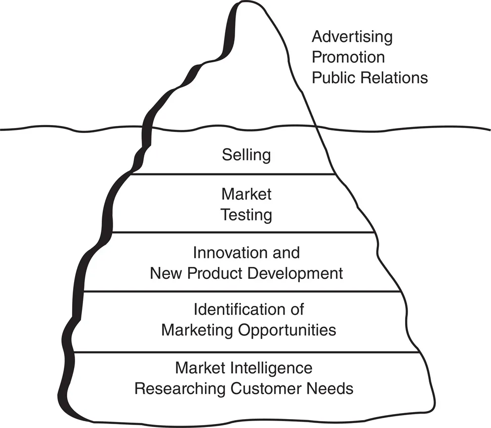Such misunderstanding about marketing is because, like an iceberg, the most visible part represents only a very small proportion of the total marketing effort. Information about products for sale is everywhere – on display in retail outlets, through advertising on television and radio, in print and in posters and, increasingly, in social media. But, as research shows, it is only when we experience an unfilled need or want that we catch sight of the tip of the iceberg and become aware of sellers who claim to have the answer to our need. To be in that happy position they will have to have identified a marketing opportunity and designed a product or service to satisfy it. They will then have to have acquired the plant, equipment, labour, supplies and all the other resources required to create a product and, apart from things that are made to order, they will then have to make and stock the product before letting it be known that it is available for sale – the tip of the iceberg! This is illustrated in Figure 1.1.