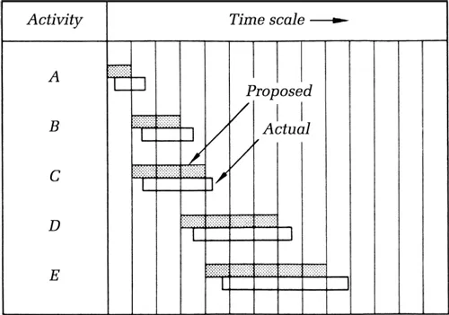A typical site-oriented control device is the Gantt Chart or Bar Chart, which allows a fairly simple and easily read plan of operations to be made available to all site personnel against which may be plotted actual performances (see figure 1.1). However, this excellent device only takes into account one of the resources, time, and unless further schedules of the resources needed for each operation are also available adjacent to the Bar Chart it does not inform on the critical relationships between the various activities depicted nor does it enable procedures involving a number of variables to be optimised since the complex interrelationships affecting the outcome of any plan (or alteration of plan) are not readily evident or quantifiable. This can, however, be achieved by means of a technique known as Network Analysis.