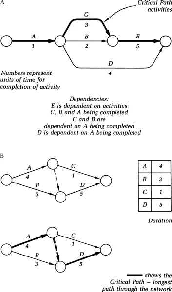 In preparing a network the project is broken down into its operational parts (this can be at a strategic level or in extreme tactical detail) termed âactivitiesâ which are represented by linear arrows (figure 1.2 A). The arrows are arranged to show the sequence of activities necessary to the occurrence of âeventsâ (shown by circles) which must precede further sets of activities. Activities (with the exception of âdummyâ activities) take up time, including waiting time, whereas events do not. An event cannot be said to have occurred until all the activities leading to it have been effectively completed.