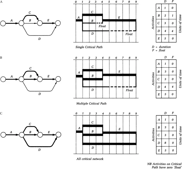 Figure 1.3 A, B, C shows how variations in time ascribed to the activities will result in different critical paths and how, in the case of C, all sequences can become critical. In theory the most perfect plan would result in an âall criticalâ network but in life this would lead to a wholly inflexible situation lacking any time to manoeuvre or rethink situations. It is in this context that the âfloatâ or difference in time between the non-critical and the critical activity times becomes important to the production planner working in changing circumstances, in that he will be given options as to how he may deploy resources.