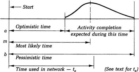 Although time is the plannerâs main parameter, other factors will affect the final assessment of times to be ascribed to the constituent activities of a network, e.g. cost, labour and material availability and the demands of other projects under the plannerâs control. It is convenient to think in terms of a ânormalâ time when planning initially and figure 1.4 shows a statistical method of arriving at the time envisaged for an activity, given some historical data, using a Beta distribution in which the area under the curve represents the probability of the time expended on an activity lying between any given points along the baseline time scale. This particular distribution curve yields the formula: