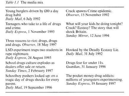 The reason we must start a book reporting on a scientific study of young people in such a 'political' way is quite simple. The key themes in this book – youth, drugs and crime – are the very same topics which have dominated domestic or home affairs in Britain and Northern Ireland through the 1990s. The fourth leg of what is almost an 'official' matrix, a potent mix, which journalists use to frame any youth–crime–drugs story is danger.