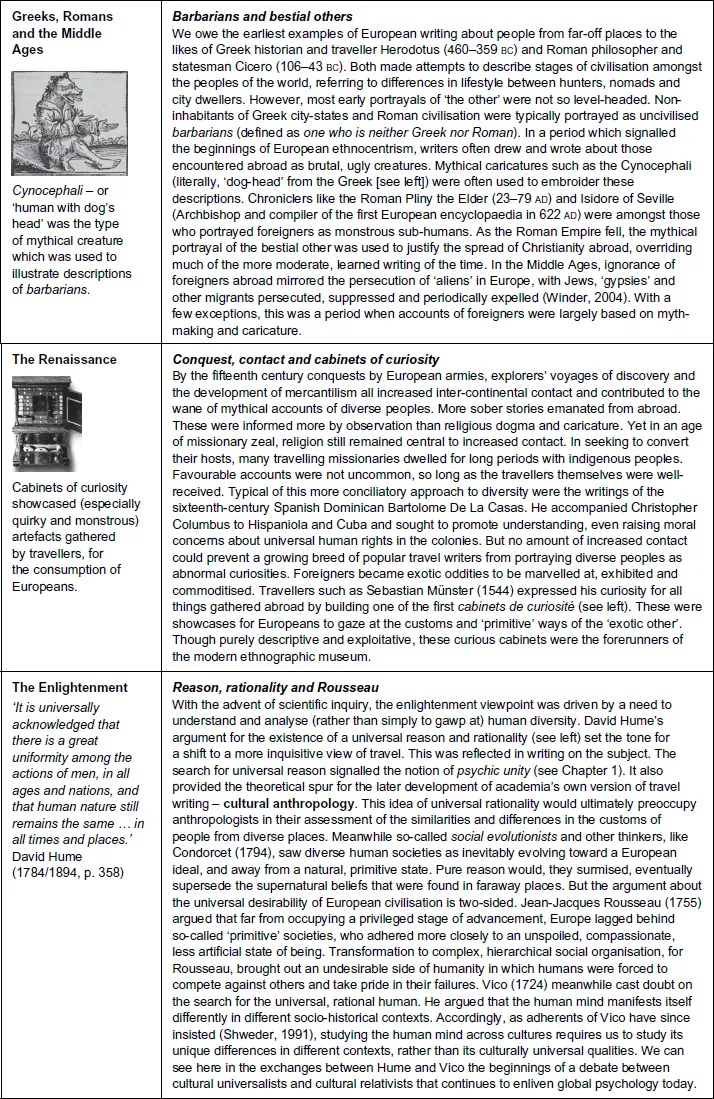 Psychologists have been doing research across cultures for generations. They have also been busy establishing research traditions within their own cultures for some time (Rus & Pecjak, 2004; Hwang, 2005; Stevens & Gielen, 2007; Kashima, 2016). Of course, these are two quite different things. The early history of psychology across cultures largely draws on the ideas and journeys of thinkers, explorers and ultimately social scientists from Europe who took it upon themselves to study people from other continents. Meanwhile the history of psychological traditions within cultures draws on what have become known as the indigenous psychologies. Youâll find an extended account of these in Chapter 5. The history of psychology across cultures is our focus in this chapter.
