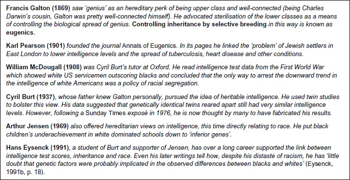 Figure 1.2 outlines some of the influential trains of thought that dominated arguments about race, temperament and behaviour in the early nineteenth century. Figure 1.3 reminds us of the unfortunate ways in which nineteenth-century racial explanations of difference and deficit in character and ability affected the work of some influential psychologists for decades to come.