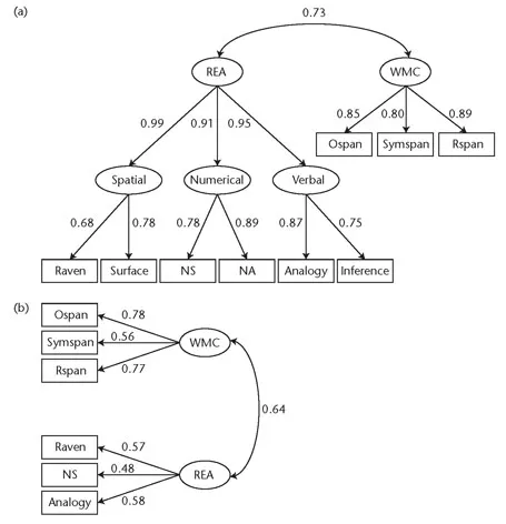 FIGURE 1.1 (a) Confirmatory factor analysis for higher-order reasoning factor (REA) based on lower-order factors composed of spatial, numerical, and verbal reas...
