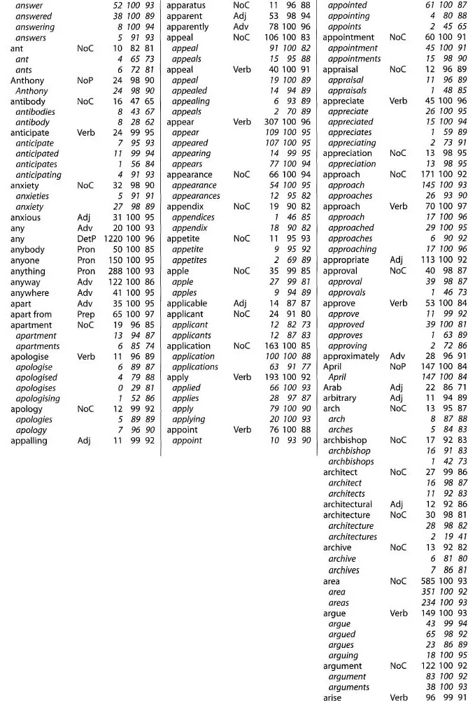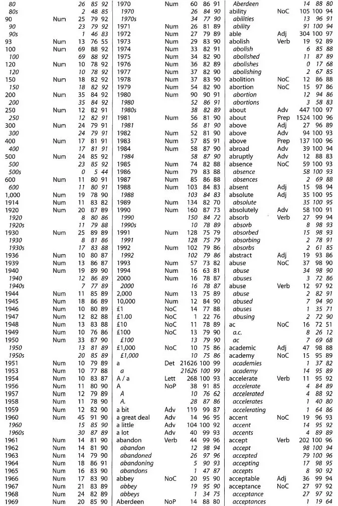 Freq | = | Rounded frequency per million word tokens (down to a minimum of 10 occurrences of a lemma per million)—see p. 5 |