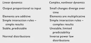 We can understand the essence of nonlinear dynamics by contrasting contemporary with traditional paradigms. Much of classical science, like Newtonian physics, is linear. In linear systems or states small inputs give rise to small outputs, while large inputs give rise to large outputs. The relationship between variables is additive, and given the relative independence of underlying aspects, cause relates to effect in ways that are dependable, repeatable, and predictable.