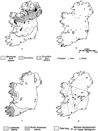 Figure 2 Maps of Ireland showing (a) extent and effects of the most recent glaciation (after Charlesworth); (b) Irelandâs mineral resources; (c) the extent of plants of Lusitanian and North American origin (after Charlesworth); (d) Irish peat deposits.