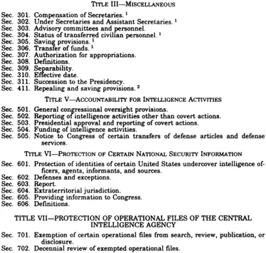 The National Security Act (1947) is the fundamental and founding legislation for the modern U.S. Intelligence Community. Much of its original structure was presaged in the report written by Ferdinand Eberstadt (see Item 116). Note that the Director of Central Intelligence and the CIA are both subordinated to the National Security Council. This act, as amended, also contains Congress's intelligence oversight authority. This copy of the act is from U.S. Congress. House. Permanent Select Committee on Intelligence. Compilation of Intelligence Laws and Related Laws and Executive Orders of Interest to the National Intelligence Community (As Amended through June 8, 1993). 103rd Congress, 1st session, 1993. (See Item 216.)