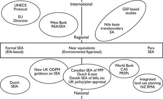Within this frame of reference, different types of SEA can be recognized, although some are at an early stage of development (Figure 1.1). These include forms of ‘para-SEA’, a term we use for processes that do not meet formal definitions of SEA or their specification in law or policy but which have some of their characteristics and elements. At present, few developing countries have established formal arrangements for SEA of policies, plans or programmes, but a growing number apply SEA-type processes and elements of SEA. There is also increasing use of a family of para-SEA tools to ‘mainstream the environment’ in international lending and development. Here, a more strategic agenda is emerging, characterized by a greater focus on policy and programme delivery.