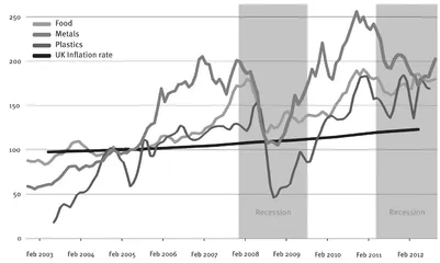 - A reversal in the trend of the last four decades of declining resource prices. The prices of food, metals and plastics of have risen in the last eight years faster than background inflation, and continued rising through a recession.