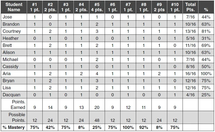 According to this data chart only one student earned the maximum number of points (4) on question #5, while all of the students earned the maximum number of points (1) on question #7. Notice also that only 1 student out of 12 got all of the questions correct, while 5 out of 12 scored below 50%. Finally, notice that the percent of mastery for each item requires that the student earn both points on the 2-point questions, and 3 or 4 points on the 4-point questions to be considered true âmastery.â