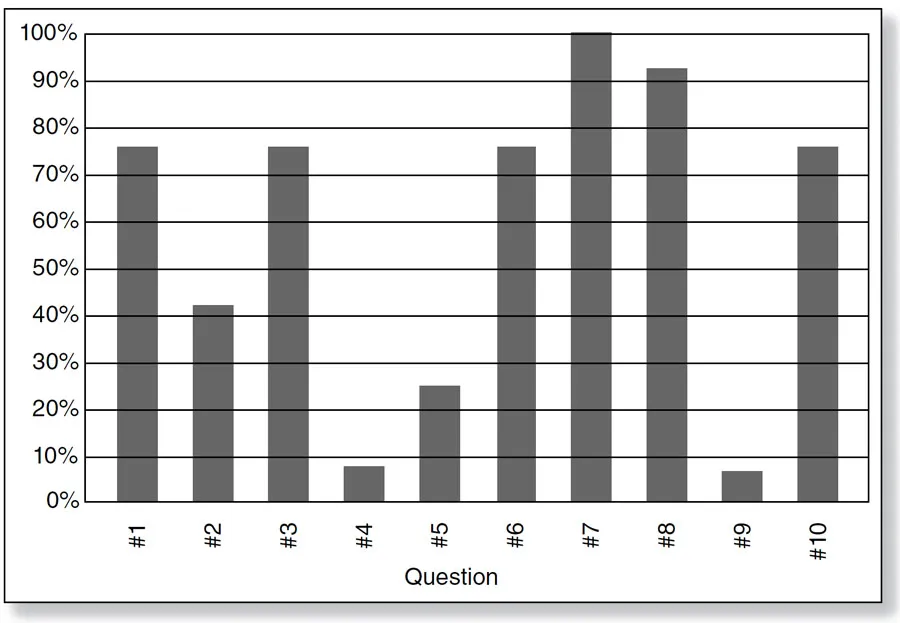Many of us like to know how our students performed on individual items. The information on the Assessment Data Chart can easily be compiled into an Item Analysis Graph. An Item Analysis Graph reflecting the data from the Data Chart in Figure 1.1 is shown in Figure 1.6 on page 6.