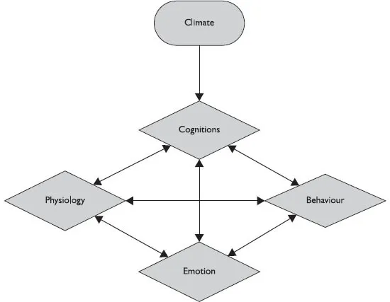 Thus a clientâs emotional state may be altered via any of the four ports of entry, cognition, emotion, behaviour or physiology in Figure 1.1, for example if the client was tense they might go for a walk, this would be an example of making a change via the physiology port. But Figure 1.1 also indicates that a clientâs emotional state is influenced by the climate that they are in, e.g. if the client has a highly critical partner this might dissuade them from going for a walk to unwind. For ease of illustration the climate is shown as operating via cognition, but in fact it exerts its effects through each of the four ports in the bottom part of Figure 1.1.