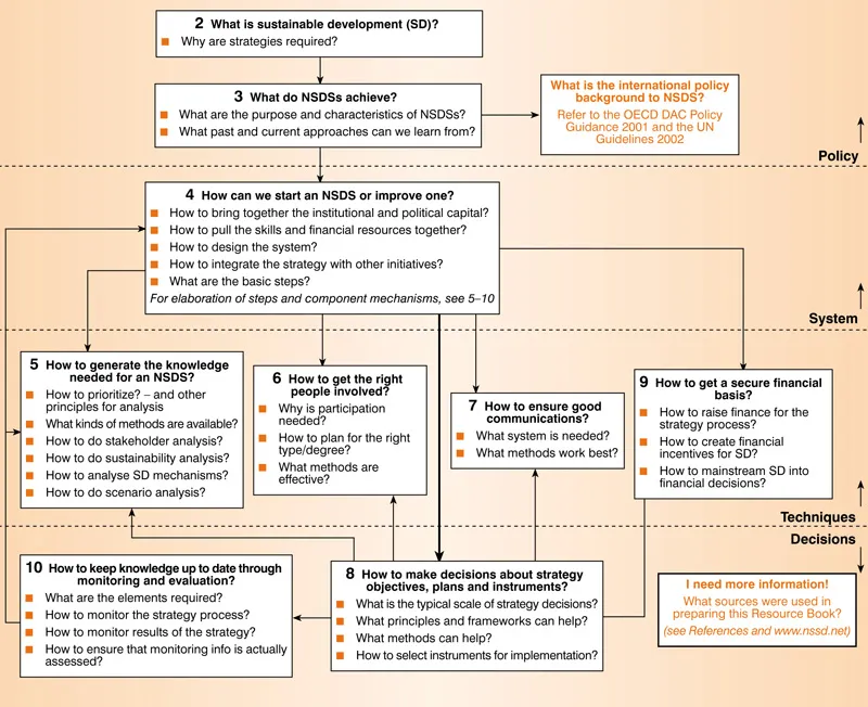 This resource book provides guidance on how to develop, implement and assess national sustainable development strategies (NSDSs). It is based on an analysis of past and current practice, in both developed and developing countries, to undertake comprehensive approaches to sustainable development. In particular, it builds on dialogues and learning in the eight countries directly involved in a project on NSDSs undertaken by the Development Assistance Committee (DAC) of the Organisation for Economic Co-operation and Development (OECD) (Box 1.1), as well as on the work of a wide range of organizations, such as the Capacity 21 initiative of the United Nations Development Programme (UNDP), the UN Department of Economic and Social Affairs (DESA), the World Bank, World Conservation Union (IUCN), International Institute for Environment and Development (IIED) and many other groups (see the extensive References chapter at the end of the book and sources of further information at www.nssd.net).