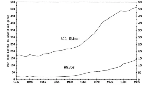 FIG. 1.1. Births to unmarried women: 1940 to 1985 (source: National Center for Health Statistics, 1986a, 1987a, 1987b)