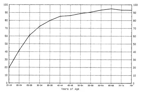 This situation changes as time passes, however, and these unmarried mothers marry, bringing a stepfather into the household. Figure 1.2 shows the proportion of never-married women with an out-of-wedlock birth who subsequently had married by 1985 when they reached a specified age. These data indicate that marriage increases substantially with increasing age for women who were never married at the time of their first birth. A small minority of such women 15โ19 years old, 19%, had remarried by 1985, but the proportion rises rapidly to a large minority, 42%, for women 20โ24 years old, and then to a substantial majority, 61% for women 25โ29 years old, and finally to very large majorities of 80% or more for women 35 years and over. As result of such marriages, many children who enter life in a one-parent family later enter a two-parent situation when the mother marries.