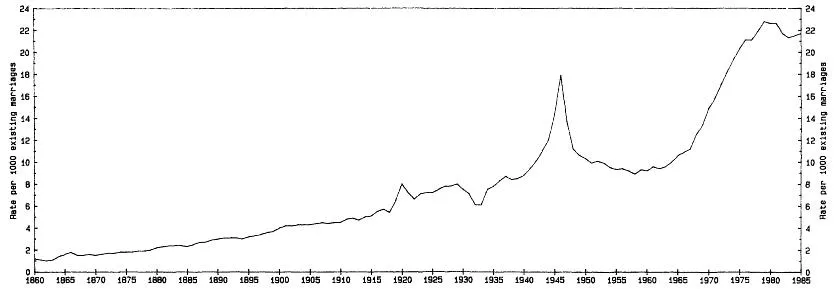 FIG 1.3 Divorce rate: 1860 to 1985 (source: Jacobson, 1959; National Center for Health Statistics, 1986b, 1987c, 1987d)