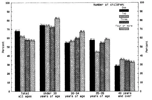 Remarriage among divorced women with children is the fourth major demographic variable that has influenced the extent to which children live with one or with two parents, and in particular the extent to which they live with a divorced mother but no father in the home or with a remarried mother and a stepfather. Figure 1.4 shows overall that remarriage occurs for the majority of women who divorce and who have at least one child at the time of the divorce. The results as of 1985 range from a small majority of 57% remarried among women who had four or more children at the time of their divorce to a substantial majority of 68% of women who had one child at the time of the divorce. Because many of these women were relatively young at the time of the survey, the proportion who will ever remarry is larger still. Figure 1.4 also shows that the proportions remarried are much larger among the younger cohorts of women, ranging for women who are under age 30 from 72% to 82% remarried, depending on the number of children at the time of the divorce (see Norton & Moorman, 1987, for an extended discussion of marriage, divorce, and remarriage trends between 1970 and 1985). These results indicate that many children who spend time in a one-parent family due to divorce will subsequently spend time in a two-parent family with their mother and a stepfather.