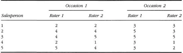 To make this discussion concrete, an example is in order. A personnel manager wishes to measure the job performance of five salespersons by using a simple rating form. The rating form covers such things as effective communication, effectiveness under stress, meeting deadlines, work judgments, planning and organization, and initiative. Two supervisors independently rate the salespersons in terms of their overall perfomance using the rating form on two occasions, with ratings from ânot satisfactoryâ to âsuperior.â The ratings comprised a 5-point scale. Table 1.1 presents data from the hypothetical example.