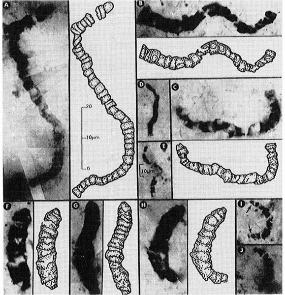 Fig. 1.1. Carbonaceous microfossil (with interpretive drawing) from the Early Archaean Apex Chert of Western Australia of 3465 million years ago. Such filamentous cyanobacterium-like microorganisms are among the oldest fossils known. Reprinted with permission from Schopf, J.W., Microfossils of the Early Archaean Apex chert: New evidence of the antiquity of life, Science, 1993, 260, 640ā646. Copyright Ā© (1993) American Association for the Advancement of Science.