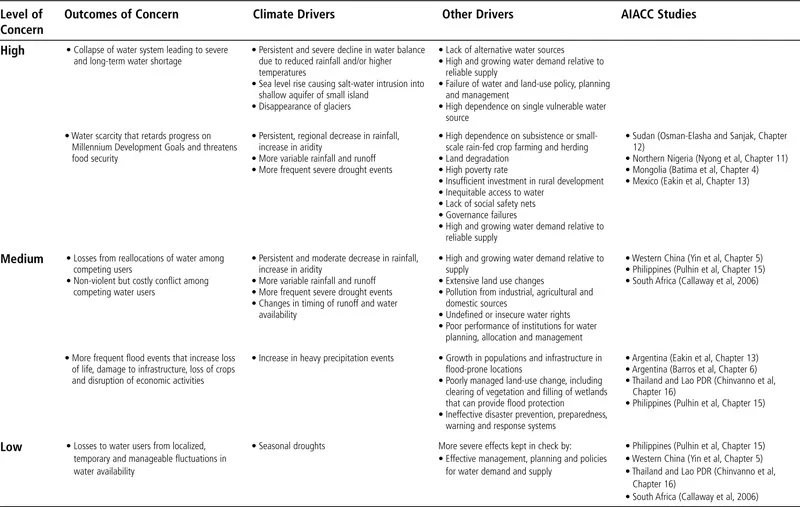 Vulnerabilities from water resource impacts of climate change are addressed by several of the case studies. Outcomes of concern for water resources from these studies and the climatic and non-climatic drivers of the outcomes are identified in Table 1.1. Scenarios of future climate change indicate that many of the study regions, including parts of Africa and Asia, face risks of greater aridity, more variable water supply and periods of water scarcity from drought. In contrast, scenarios suggest that the climate may become wetter and water supply greater in southeastern South America and southeastern Asia.
