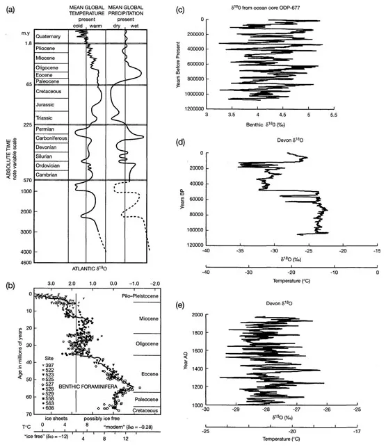 Figure 1.1 shows the reconstructed variation in the average surface air temperature of the Earth, with each successive panel showing greater detail for time spans progressively closer to the present. Figure 1.1(a) gives a generalized temperature and precipitation history of the Earth during the past 3 billion years based on a variety of paleoclimatic indicators, some of them qualitative in nature. Figure 1.1(b) shows the variation in the oxygen isotope composition of bottom-dwelling foraminifera in the global ocean during the past 70 million years, along with a rough quantitative temperature scale. The deep waters of the worlds oceans decreased from about 12°C around 60 million years ago, to near 0°C at present. Figure 1.1(c) shows the variation in the oxygen isotope composition of bottom-dwelling foraminifera at Ocean Drilling Project site 677 during the past 1.2 million years; fluctuations at this time scale are largely the result of variations in the global volume of ice on land. Figure 1.1(d) shows the variation in the oxygen isotope composition of ice that accumulated on Devon Island, in the Canadian Arctic Archipelago, during the last 120,000 years. These fluctuations are related to changes in the temperature of the air masses over the ice, and a rough temperature scale is provided based on the correlation between the oxygen isotope composition of Arctic precipitation and temperature given in Johnsen et al. (1989). Finally, Figure 1.1(e) shows the variation in the isotope ratio in Devon Island ice during the past 1000 years. From these data it can be seen that the Earthās climate changes at a wide range of time scales, with decadal-scale variations superimposed on century and millennial time-scale variations, which in turn are superimposed on variations spanning tens of thousands of years, which are superimposed on still longer time-scale variations, and so on. Major episodes of glaciation, interspersed with interglacial intervals, occurred during the pre-Cambrian period, during the Permo-Carboniferous period, and during the past 3 million years. In between these glacialāinterglacial episodes have been extended periods with climates substantially warmer than during the present interglacial period. In short, the climate is a dynamic, constantly changing phenomenon.