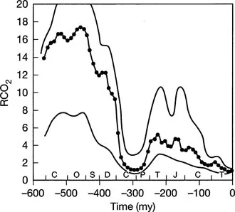 Figure 1.2 Reconstructed variation in atmospheric CO2 concentration during the past 570 million years. Reproduced from Berner (1994).