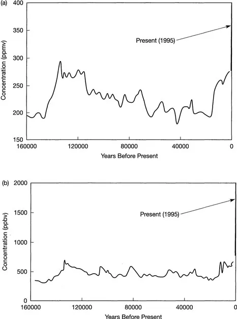 Figure 1.2 shows the variation in atmospheric CO2 concentration over the last 570 million years as inferred from computer models that simulate the geological time-scale flows of carbon. There is no direct record of atmospheric CO2 concentration this far back, but measurements of quantities that would have been affected by changes in the carbon cycle, such as the chemical composition of oceanic sediments, can be used as a rough check on these models. According to the results shown in Figure 1.2, the atmospheric CO2 concentration has varied significantly over periods of tens to hundreds of millions of years, reaching concentrations of 4ā16 times the pre-industrial concentration of 280 ppmv (parts per million by volume), albeit with a large uncertainty range. Figure 1.3 shows the variation in atmospheric CO2 and CH4 concentration over the past 160,000 years as directly measured in air bubbles trapped in Antarctic ice. Also shown on Figure 1.3 are the present concentrations of CO2 and CH4, and a continuation of the upward trend during the next few centuries as a result of human emissions. During the last 160,000 years, CO2 underwent natural variations in concentration from as low as 180 ppmv to as high as 300 ppmv, while CH4 varied between 0.3 and 0.7 ppmv. In contrast, human activities during the past 200 years have increased the CO2 concentration to over 360 ppmv and the CH4 concentration to over 1.7 ppmv. Furthermore, the rates of change during the last 200 years far exceed the rates of change that occurred naturally during the preceding 160,000 years.