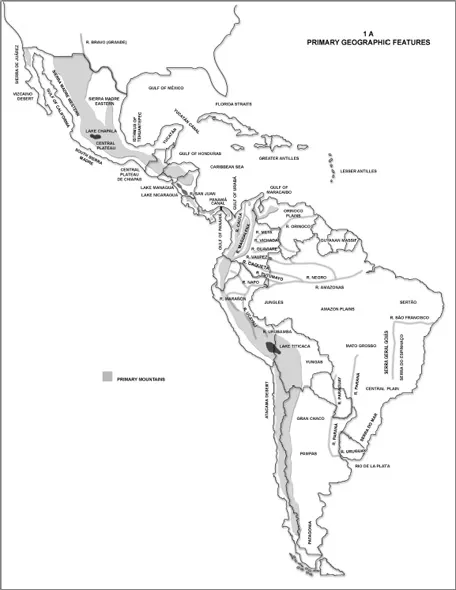 Additionally, Latin America represented a vast array of natural resources that were of paramount importance to the invading Europeans. Silver and gold could be found in Mexico, Peru, Bolivia, and Colombia; sugar adapted easily to the climactic conditions of the Northeast of Brazil and the Caribbean islands; cacao became the principle export of what would become known as Venezuela. The diverse agricultural and mineral wealth reflected the variety of climates and geography in the Latin American region. There are three basic structural divisions that help clarify Latin Americaâs geography. First, moving from the Atlantic toward the Pacific Ocean, there are the high eastern plains of Brazil and Guyana; the second division is generally referred to as vast interior lowlands, which extend (northâsouth) from Venezuela to Argentina and conform about five general geographic subdivisions: the llanos (or grassy plains of Venezuela and Colombia), the Amazon flatlands, the Chaco region of eastern Bolivia, the Argentine grasslands known as the Pampas, and the Patagonia plateau. This zone is comprised of the important Orinoco, Amazon, and River Plate river systems and tributaries. Finally, there are the western highlands, which extend from the south of Chile to the north of Mexico and through the Antilles. The Andes mountain range forms the spine of the Latin American continent: the mountains begin in southern Chile, divide in two places in Bolivia, run through Peru and Ecuador, divide again in Colombia, and terminate in Venezuela and Colombia at the Caribbean Sea. Mexico is characterized by vast deserts in the north, and mountains in the south, west, and central regions of the country.