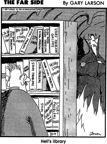 I often elicit an emotional reaction when I tell people that I do research on solving algebra word problems. Some people are quite good at doing this and enjoy the challenge. More typically, people moan. They never did very well at solving word problems, and may feel helpless when their children need assistance with their homework. Gary Larsonās cartoon (see Fig. 1.1) captures this typical reaction.