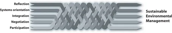 The five braided strands of social learning that appear to be crucial to environmental management are shown in Figure 1.2. They are braided in the sense that they interact and overlap, yet each has an important role on its own. We discuss each of the five strands (reflection, systems orientation, integration, negotiation and participation) in the subsections to follow, and then combine the strands to provide a framework for analysing the case studies to follow.
