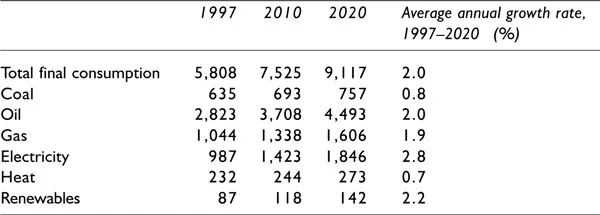 Figures 1.3 and 1.4 show the estimated change in world primary energy supply by region from 1997 to 2020. They show a predicted increase in demand in developing countries from 34% in 1997 to 45% in 2020, China being the developing country with the greatest increase. In 1997 OECD countries accounted for just over 1 billion people (around one-sixth of the world population) and a staggering 54% of world energy demand, whereas in developing countries and economies in transition around five billion people consumed only 46% of world energy supply. This made the average energy consumption per capita in OECD countries around six times higher than in developing countries and EITs. The comparison is even more stark if one looks only at the least developed countries. These regional statistics hide the fact that on an annual basis the 2 billion poorest people, whose income is US$1,000 or less, use barely 0.2 toe of energy per capita, whereas the billion richest people, whose income is US$22,000 or more, use approximately 5 toe per capita – around 25 times as much. 4