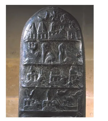 Kudurru of Babylonian king Melishishu II shows emblems of the gods Anu, Enlil, and Ea. Above them are the crescent of the moon god, the star of Ishtar, and the sun of Shamash. At the bottom are a snake and scorpion of the underworld. (Erich Lessing/Art Resource, New York)
