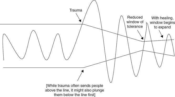 Trauma either sends a person over the line, with the emotions so intense they can feel out of control, or below the line, where the intensity drops out, leaving the person deadened, devoid of emotion. Typically, the traumatized person swings between extremes, from hyper to hypoaroused, going through waves of ups and downs, which gradually decrease over time. While in this traumatized place, the person becomes less able to tolerate new incoming stimuli. Already in overwhelm, not much more can be taken in or dealt with adequately. Simple, ordinary frustrations or difficulties feel like overwhelming crises, and the person canât handle them in normal ways. As the person heals, the waves of emotion subside, and if the person heals well, the ability to tolerate emotional intensity will increase. Post-traumatic growth is possible, with greater ability to tolerate higher and lower levels of emotional intensity and stay conscious and present. Without healing, however, the Window of Tolerance may remain small, resulting in an inability to deal with intense emotions that come after the trauma.