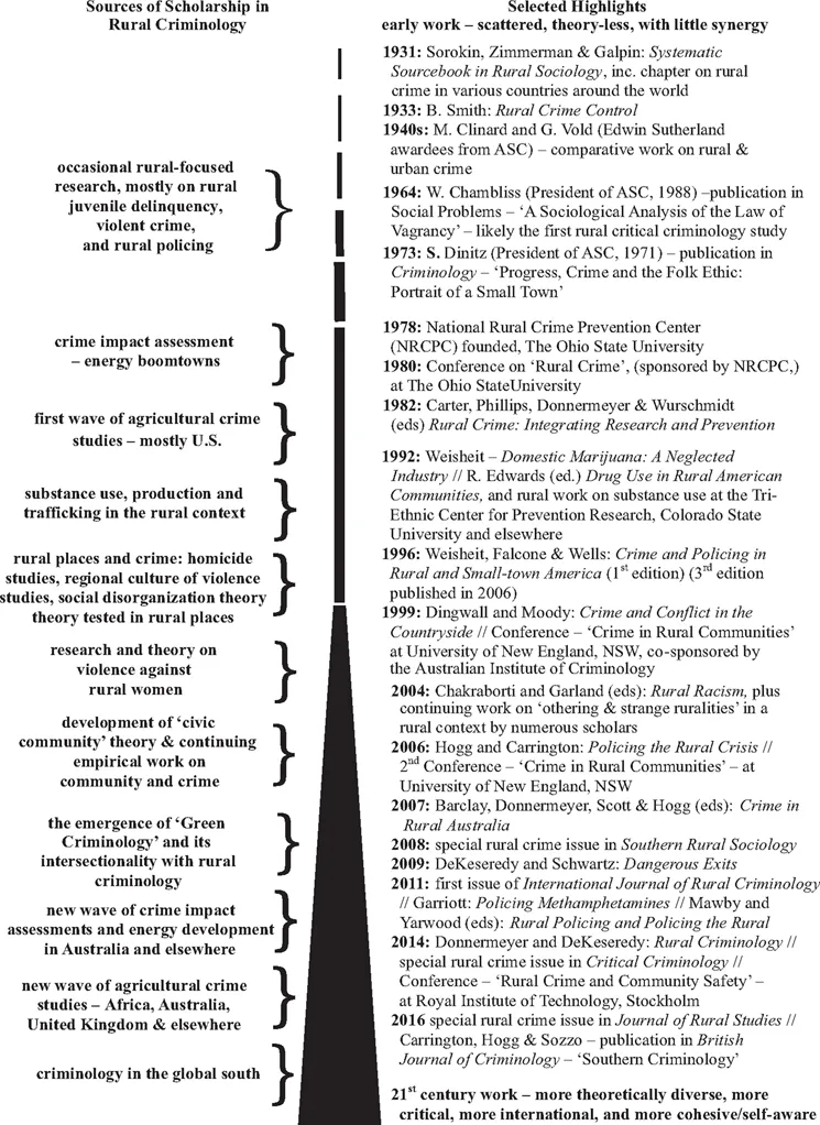 Figure 1.1 presents a visual chronology of both important events in the development of rural criminology (right side), but also sources that helped spur its development (left side). It cannot include everything, but does attempt to highlight what I believe to be important publications and events in rural criminology's history. As well, the short historical narrative that follows is not inclusive, but attempts only to provide an overview. I admit in advance to a bias related to events and publications that influenced my career as a rural sociologist turned criminologist working at large, land grant universities in the Midwestern region of the US. There is much more to the story of rural criminology's development that I likely am not aware.
