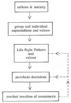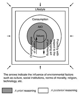 Lazer’s definition (1963) of lifestyle is very general. It straddles the line between individual and aggregate elements of behavior: “Lifestyle is … the result of forces such as culture, values, the symbolism of certain objects, moral values, and ethics. In a certain sense, the aggregate of consumer purchases and the manner in which these purchases are used reflects the lifestyle of a society.” This definition is linked to the idea of a system whose process can be schematized, as shown in Figure 1.1.