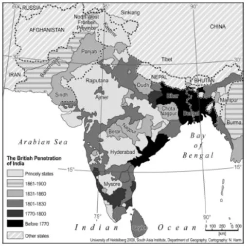 The Indians noticed the challenge posed by the British nation very slowly. Therefore their response took a long time. They were not confronted with a large foreign occupation army, which might have provoked immediate resistance. The British gradually usurped and transformed Indian institutions. After the decline of the Mughal empire, the commercialization of power had increased in India.5 Some Indian rulers mortgaged their states to merchants who organized the collection of their revenues and managed their treasury. In this context the activities of the East India Company were not unusual. This company could adjust much more easily to Indian conditions than an administration manned by royal officers of a foreign power would have done. The servants of the East India Company could play many roles. Initially they were hired as commercial employees only. Their salaries were meager, and they had to pay a large deposit when beginning their career. It was taken for granted that they would enrich themselves in India. The deposit would be forfeited only if they hurt the company’s interest by their machinations. If they served the company well, they could quickly rise to high positions.