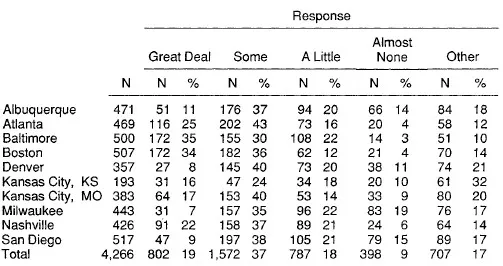 Source: David Caputo, Urban America: The Policy Alternatives (1976, 65). Data were collected as part of the Urban Observatory Program funded by the Department of Housing and Urban Development. The question asked was āIn some cities, officials are said to take bribes and make money in other ways that are illegal. In other cities, such things almost never happen. How much of that sort of thing do you think goes on in [this city]?ā