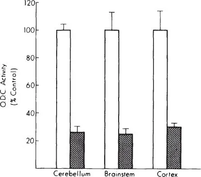 Ornithine decarboxylase (ODC), the first enzyme in the synthesis of the polyamines putrescine, spermine, and spermidine, is an important regulator of growth and differentiation that is affected by mother-pup interactions. The end products of this enzyme are intimately involved in the regulation of protein and nucleic acid synthesis (Bachrach, 1973; Raina & Janne, 1970), and activity of this enzyme is thought to be a sensitive index of environmental effects on biochemical and physiological processes in the developing animal. While ODC activity in both neonatal and adult rats responds markedly to various stresses, the pattern of tissue response is determined by the nature of the environmental stimulus, or stress. Separation of preweanling rat pups from the mother (maternal deprivation), is one stress that profoundly affects tissue polyamine systems in developing animals. Maternal deprivation causes an immediate and marked decrease in tissue ODC activity and in tissue putrescine concentration. These changes occur in all tissues that we have studied including brain, liver, heart, kidney, and spleen, and in all brain regions (Fig. 1.1, Table 1.1). ODC activity normalizes soon after rat pups are returned to the mother (Fig. 1.2). This marked effect of maternal deprivation is observed in preweanling pups, from postnatal Days 1 to 18 (Fig. 1.3). It then rapidly disappears over the next few days.