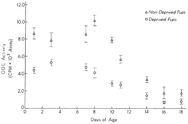 The decline in ODC associated with maternal deprivation does not result from a change in body temperature, exposure to an unfamiliar environment, or other nonmaternal stimuli (Butler & Schanberg, 1977). Similarly, interruption of feeding does not mediate the fall in ODC, inasmuch as preweanling rat pups placed with a mother whose nipples have been ligated do not experience a similar decrease of ODC activity in all tissues. The latter demonstration is extremely important, given that feeding is one of the major components of the mother-pup interaction during the first 2 postnatal weeks, with pups feeding an average of every 10 min (Lincoln & Wakerly, 1974). Furthermore, auditory, visual, and olfactory stimulation, which play a role in mother-pup interaction at various times during the development of preweanling rats, do not influence ODC activity (Kuhn & Schanberg, unpublished observations). Apparently those stimulus modalities are not involved in the ODC response of preweanling rats to maternal deprivation. This is not surprising in that both the auditory and visual systems are not functional at birth, but mature during the first 2 to 3 weeks postpartum.