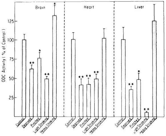 Fig. 1.4. Pups were maternally deprived for 2 hours and either left untouched or stroked heavily, stroked lightly, or pinched as described in Methods and then killed. Controls were left undisturbed with the mother for 2 hours. Results are expressed as percent control ± SEM. Control ODC activity = 0.147, 0.188 and 0.048 nmoles ornithine/g tissue/hour respectively for brain, heart and liver.* = p < .05 or better compared to controls.** = p < .001 or better compared to controls, n ≥ 15 except pinched and light stroking n ≥ 8.