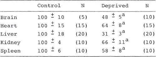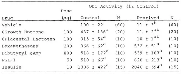 Growth hormone is a well-known regulator of ODC activity in brain as well as in peripheral tissues (Roger, Schanberg, & Fellows, 1974). Therefore, the finding that growth hormone secretion decreased during maternal deprivation provided a possible explanation for the fall in tissue ODC activity. To investigate this possibility, we injected pups with ovine growth hormone during the separation procedure to reverse the decrease in ODC activity. Rather than restoring ODC activity to normal levels, as predicted, we found that tissue ODC was completely and selectively unresponsive to growth hormone during maternal deprivation. Growth hormone was unable to induce ODC activity in liver or brain of deprived rats, although a number of other hormones including cyclic AMP, insulin, and the glucocorticoid hormone dexamethasone still would induce ODC activity normally (Tables 1.2, 1.3). This selective loss of tissue response to growth hormone represents the third major defect in growth-regulating processes that is disrupted by maternal deprivation.