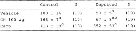 Pups were maternally deprived for 2 hours, injected intracisternally with saline, GH or cAMP, returned to the deprivation cages and killed 4 hours later. Control pups left with the mother were injected at the same time. Results are expressed as % control ± sem. Control ODC activity was 40 nCi/30 min/g tissue.