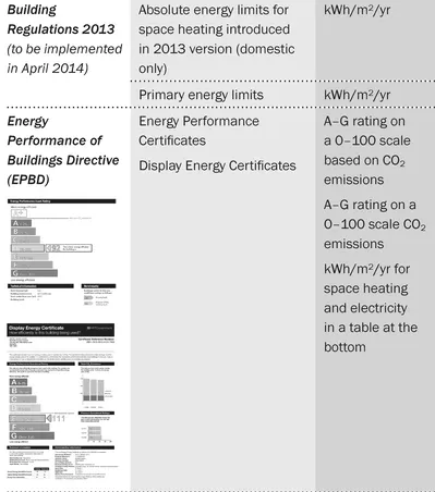 The table partly serves to elucidate, but also illustrates that the many different ways of talking about the energy and carbon performance of buildings are a feature of the regulatory framework. And that they use terminology that confuses rather than clarifies. So if some of the following does not seem instantly meaningful, thatās because it is unnecessarily complex. These include CO2 emissions as the headline indicator, EPC ratings with AāG and numerical scales, and display energy certificates where the main metric illustrated in the AāG grades is actually CO² rather than energy. It is not a given that a building with low carbon emissions is low energy, if higher energy demand is being met by zero carbon technologies, simply substituting higher emissions energy with lower emissions energy.