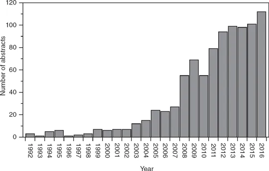 The field of mathematical cognition has grown rapidly over the past decade. For example, a citation search for the terms ‘mathematical cognition’ or ‘numerical cognition’ in Web of Science identified a marked increase in the number of items published since 2007 (see Figure 1.1). Developments such as a new journal, Journal of Numerical Cognition, launched in 2015 and a new society, The Mathematical Cognition and Learning Society, founded in 2016, demonstrate that the field has become established and is set to grow further. As the number of academics working in the field of mathematical cognition grows, it is likely that this is a topic that will increasingly appear in undergraduate and postgraduate psychology, neuroscience and education courses and therefore introduce a new generation of researchers to the field. We hope that this book will help in this endeavour by providing an accessible introduction to key theories, notable findings and ongoing debates in the field.
