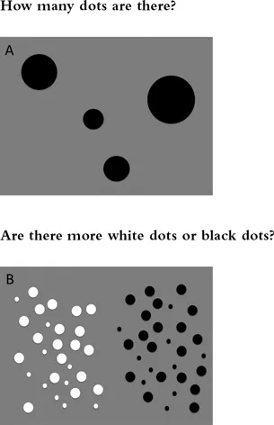 What do we mean by nonsymbolic numbers? We are surrounded by numerosity all day, every day, and we perceive nonsymbolic numerosity, i.e. the quantity of objects, typically in one of two ways. For small numbers of objects or tones, for example, we just seem ‘to know’ the exact number without having to count. People often say ‘the number just popped out to me’, ‘I just knew that there are three people’. In task A above, for example, we just see that there are four dots, whereas for larger numbers of objects we either need to count or to estimate their numerosity. We are also able to compare two sets of larger quantities accurately without counting, as long as the difference in numerosity between the two sets is large enough (for example, task B above). Counting depends on language abilities and will be discussed in Chapter 3. In this chapter we will focus on types of enumeration of objects that are language-independent.