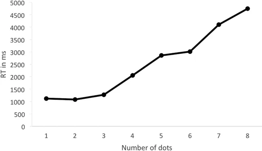 When participants are asked about the numerosity of briefly presented arrays of items, participants are fast, accurate and confident for small numbers of items (typically 1–4), but take longer, make more errors and are less confident the larger the numerosity. Figure 2.1 shows a typical performance pattern characterised by a discontinuity in the response time function around 3 or 4 objects. There is a small or no increase in reaction time (RT) for each additional item in the so-called subitizing range (1–3) and a larger increase per item outside the subitizing range (larger than 4).